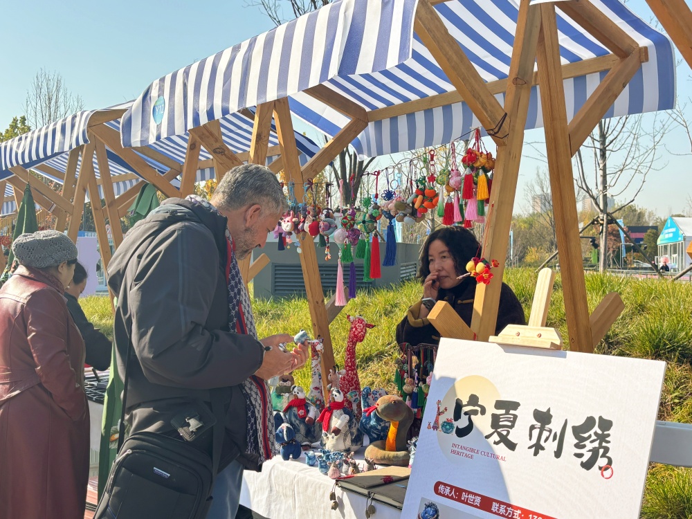 11月11日,一名外國游客挑選寧夏刺繡產品。當日,“2025年公共文化產品和服務采購大會”在北京城市副中心三大文化建筑戶外場地舉行,寧夏刺繡、手工毯、剪紙、灘羊皮鞣制等多項非物質文化遺產代表性項目精彩亮相。寧夏日報報業集團全媒體記者 張雪梅 攝