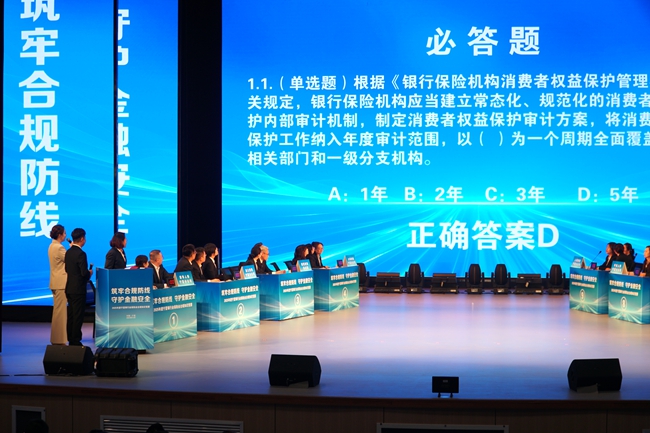 本次大會旨在通過“以賽促學、以學促用”的生動形式,全面總結專項行動成效,并部署下一階段工作,著力提升全員合規(guī)專業(yè)素養(yǎng),積極營造“人人合規(guī)、主動合規(guī)”的濃厚文化氛圍。競賽環(huán)節(jié)緊張激烈,精彩紛呈。經(jīng)過前期線上選拔賽,銀行與保險機構分別有9支隊伍脫穎而出,進入決賽。每支隊伍由3名場上選手及2名場下智囊團成員組成。