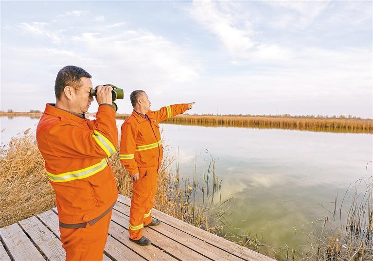11月11日,工作人員在寧夏平羅天河灣國家濕地公園內(nèi)觀察候鳥。